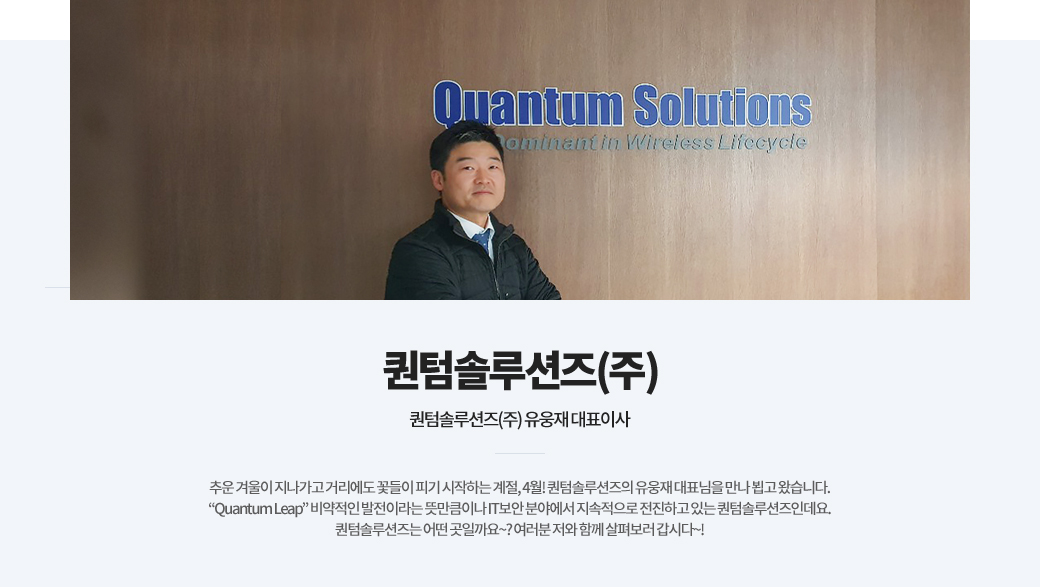 네. 안녕하세요. 저는 퀀텀솔루션즈의 유웅재 대표입니다. 저는 네트워크 엔지니어로 처음 사회생활을 시작했습니다. 3년 10개월의 엔지니어 생활을 마무리한 후에는 IT영업으로 직무를 전환했죠. 벌써 IT영업으로만 23년째가 됐네요.